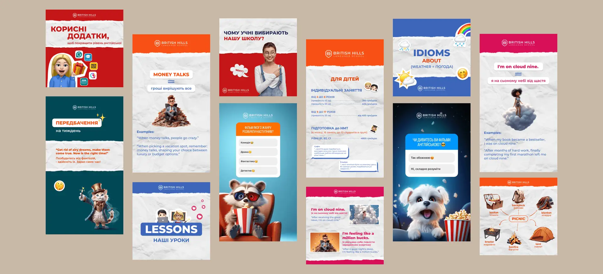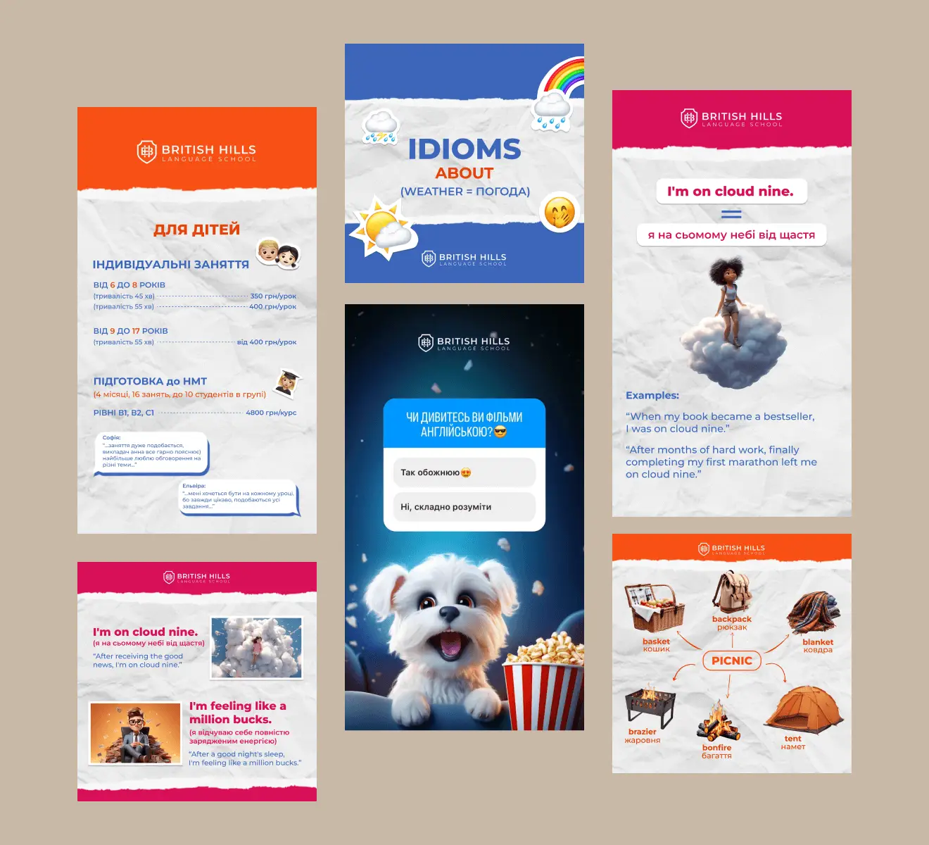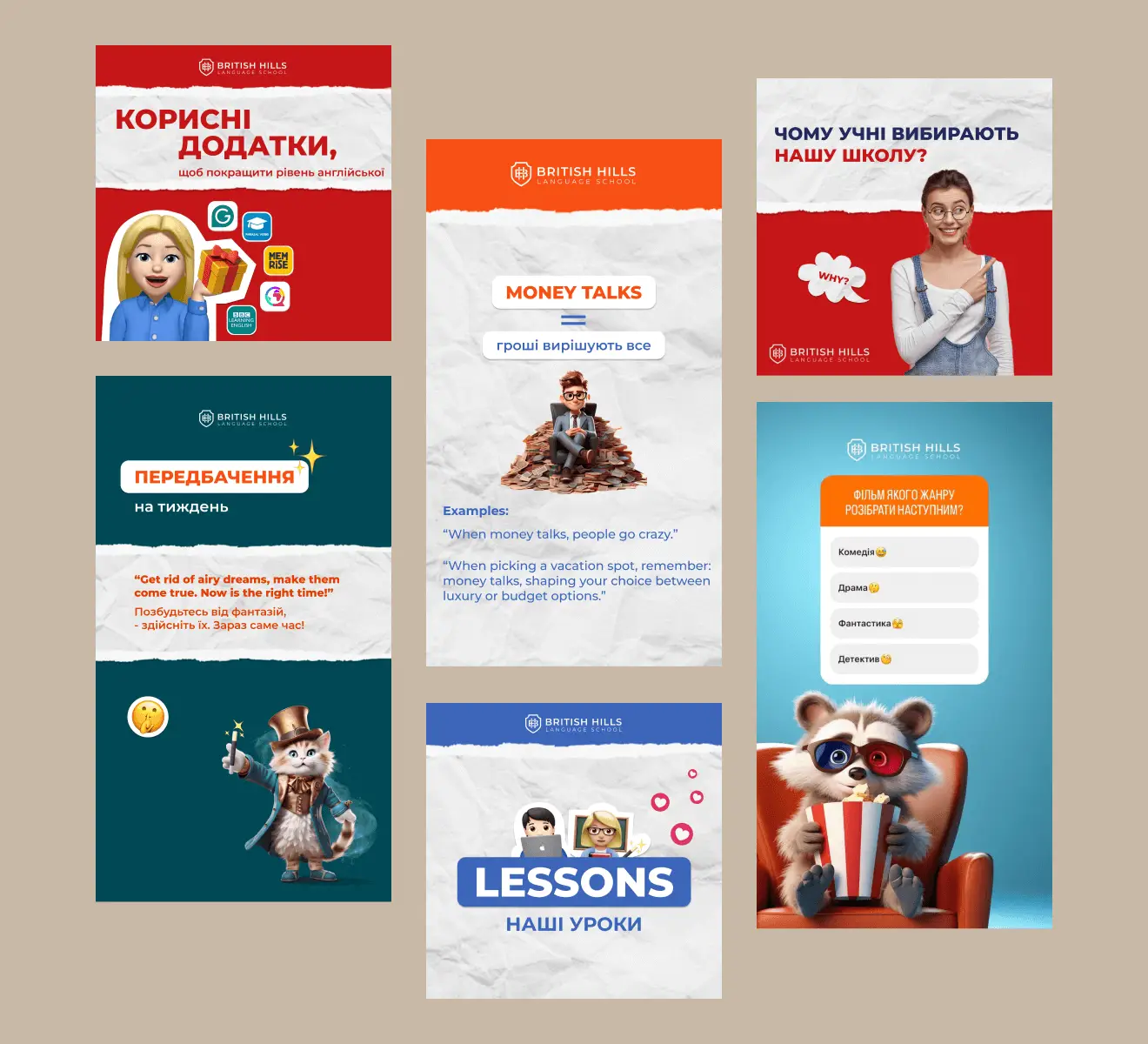 Created a series of bright, and playful Instagram posts and stories for an English language school to catch the attention of potential students. The visuals combine vibrant colors, AI-generated objects, and engaging designs to promote courses, share learning tips, and boost interaction. Posts include fun, interactive elements like quizzes and polls, while stories feature testimonials, success stories, and announcements for upcoming events.