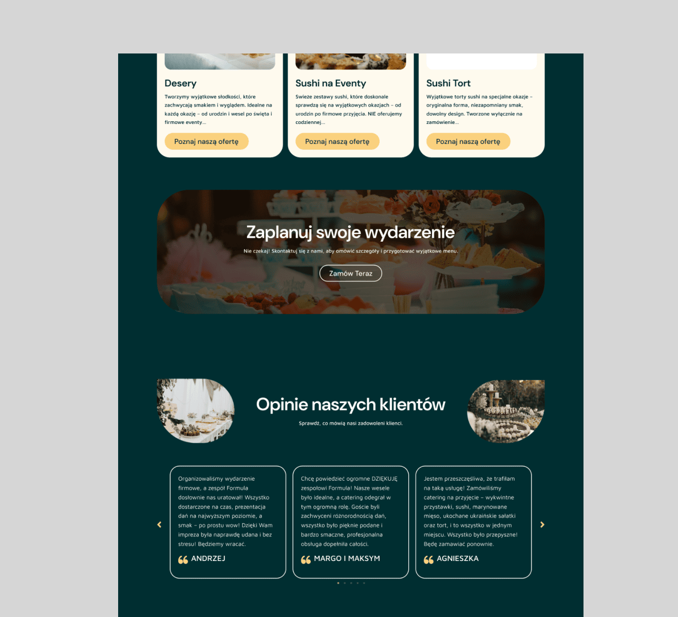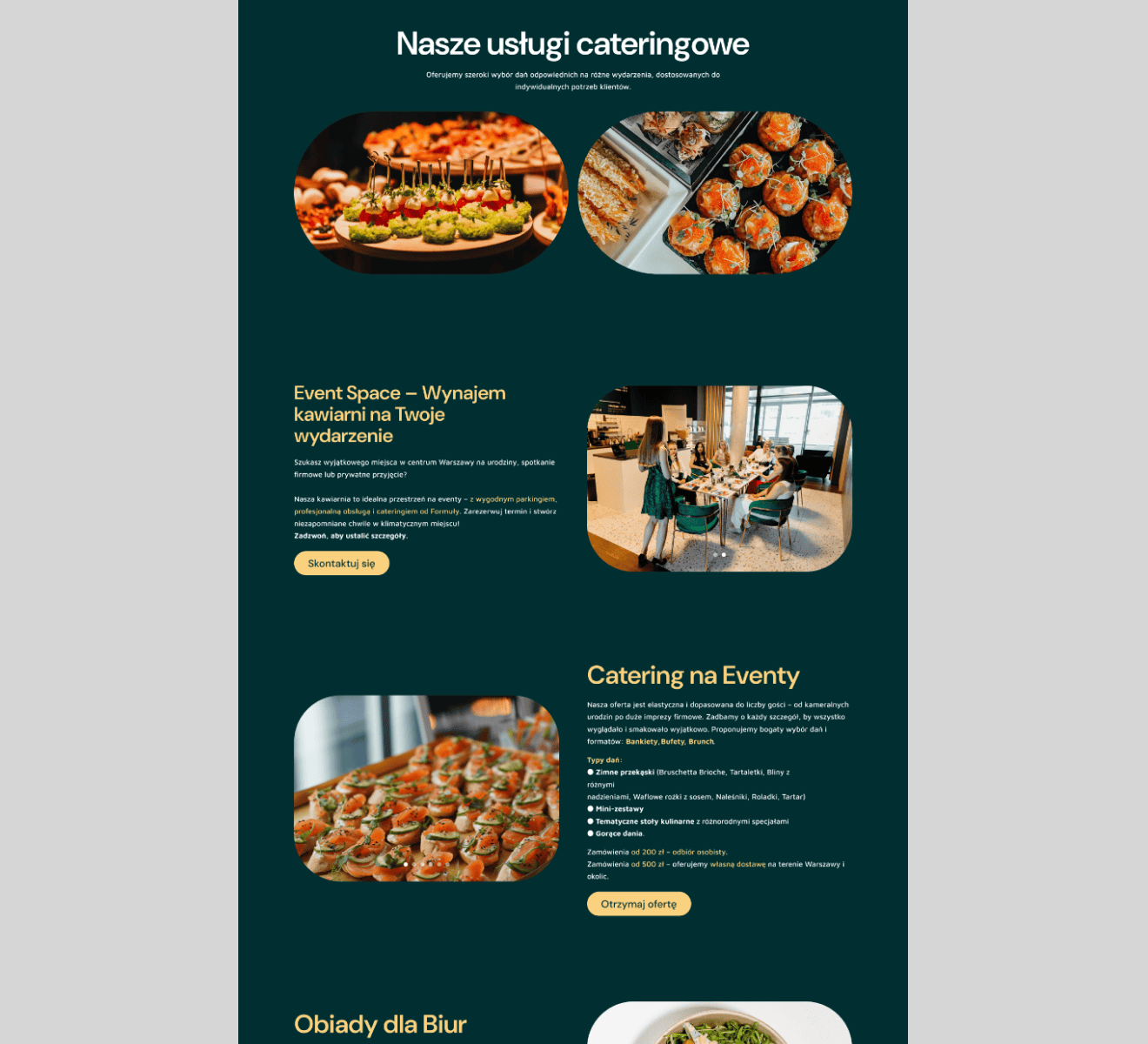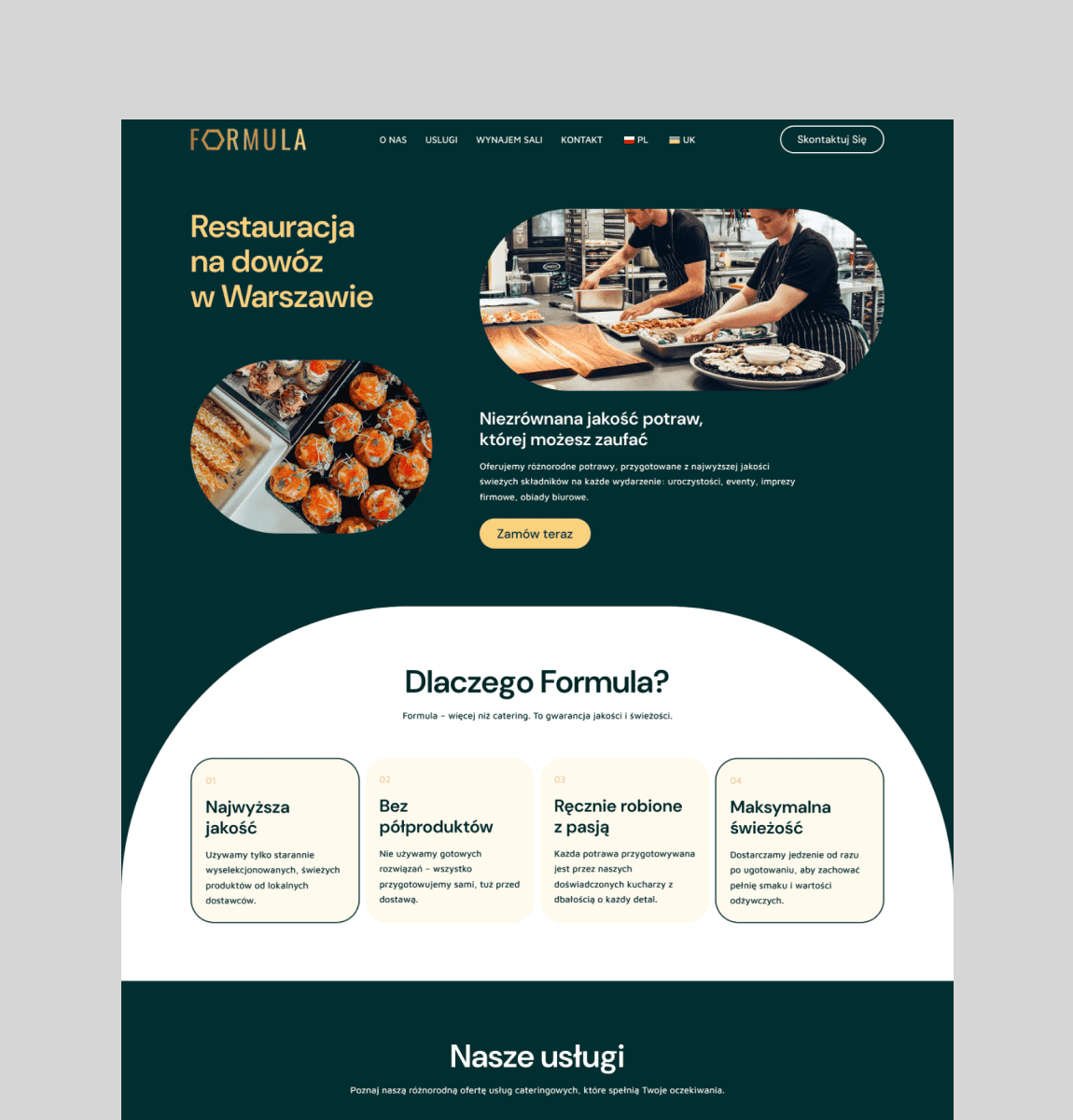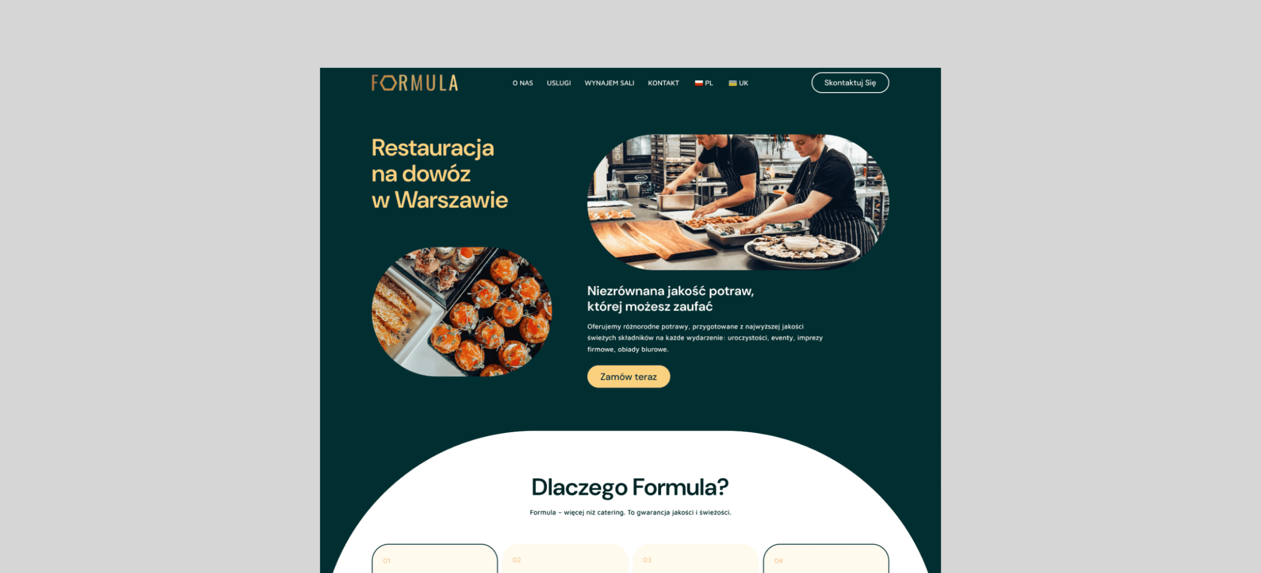 Designed a modern, responsive WordPress website for Formula Catering in Warsaw, showcasing their catering services, menus, and special offerings, with a strong focus on user experience and intuitive UI design. Every page from the homepage to service pages, menus, and custom product cards was carefully crafted for seamless navigation and visual appeal, emphasizing clean typography, high-quality images, and clear call-to-action elements. Here were implemented simple yet effective lead forms, a testimonials section to build trust, and an optimized site structure for fast performance. This project combines modern web design, and functional development, allowing the client to easily manage content while providing visitors with a smooth, engaging, and user-friendly experience.