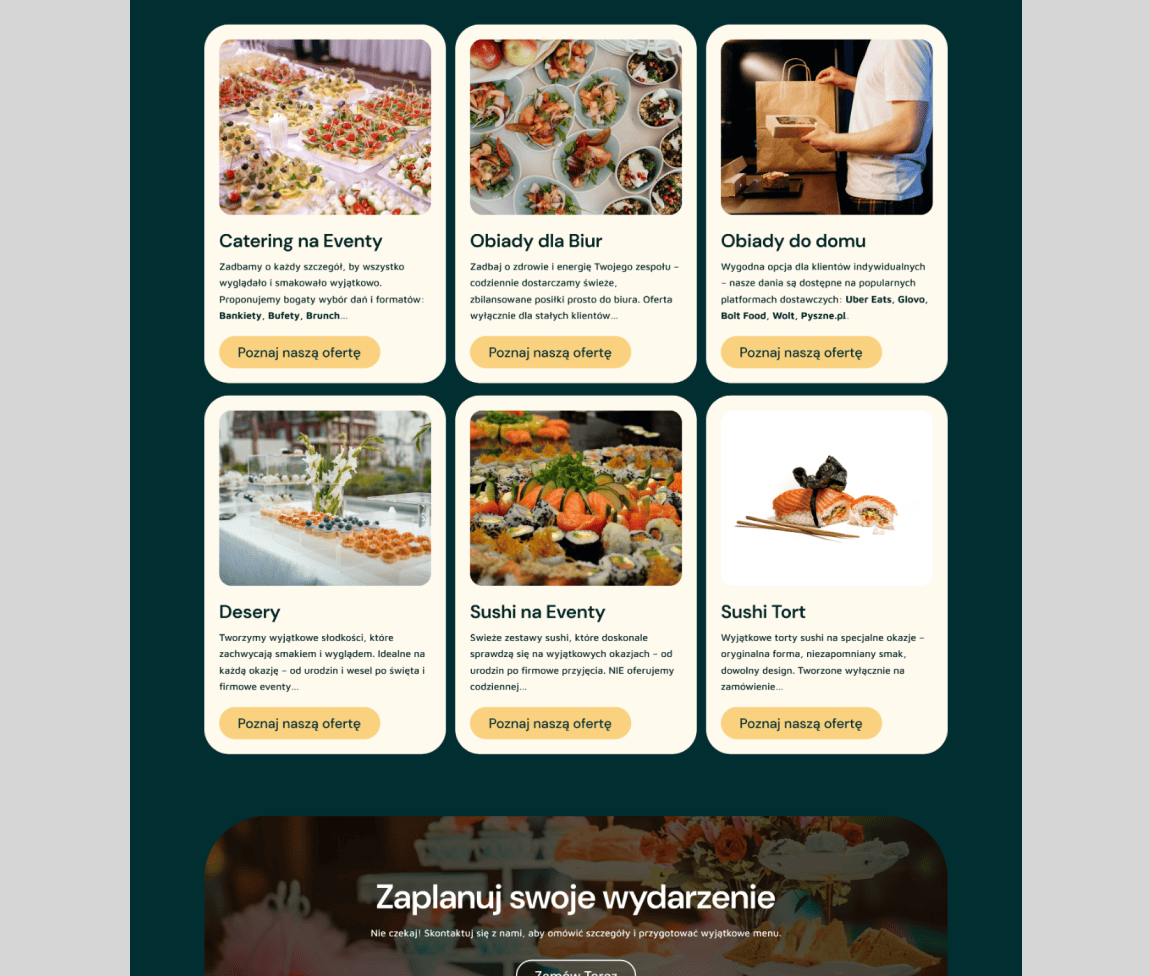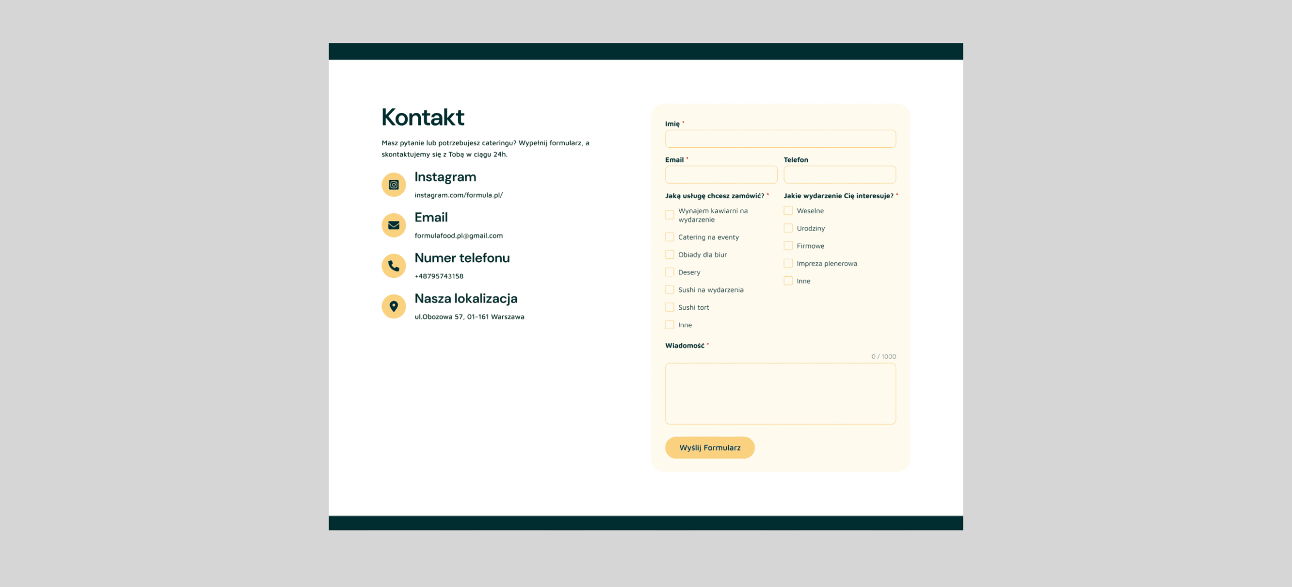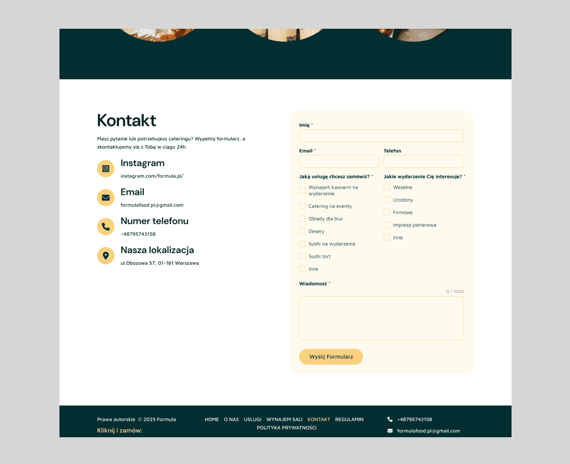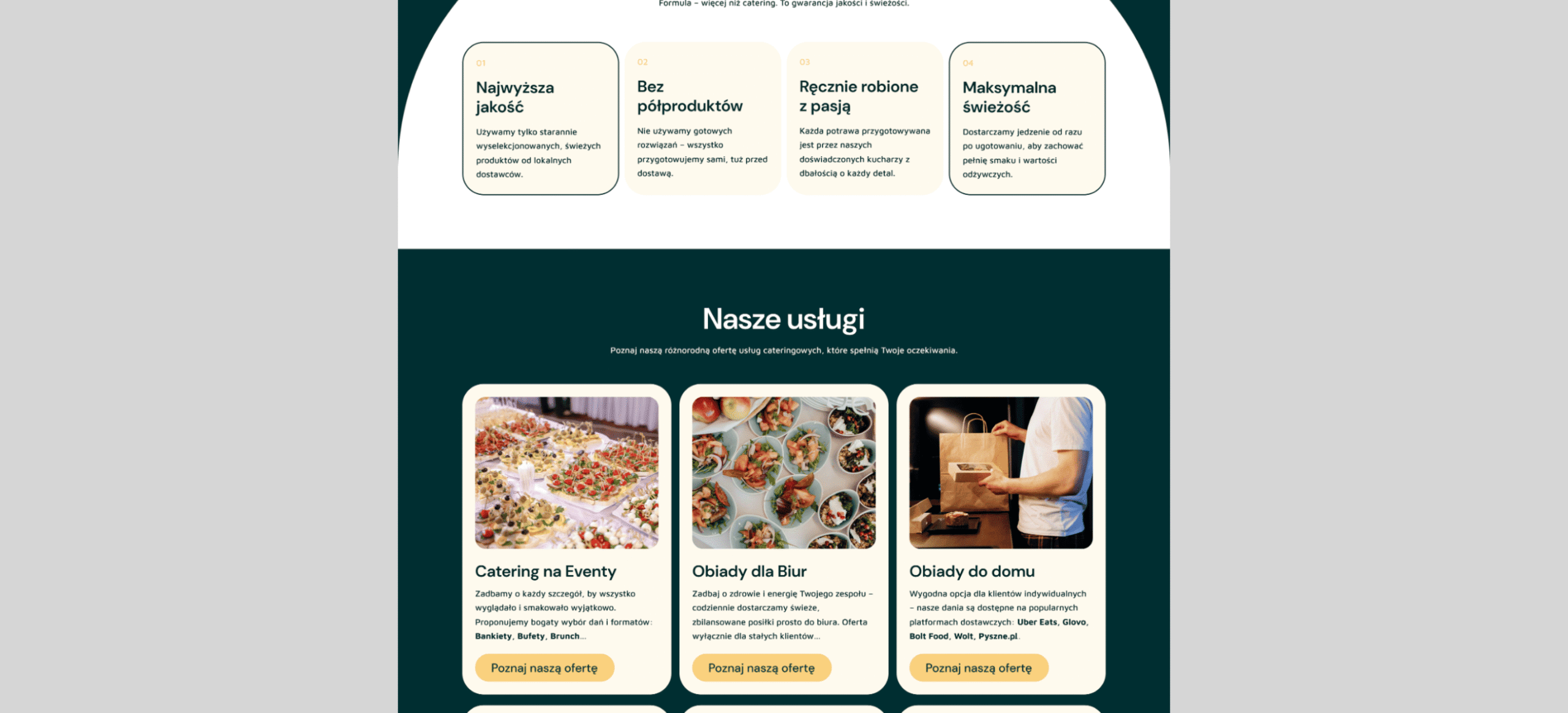 Designed a modern, responsive WordPress website for Formula Catering in Warsaw, showcasing their catering services, menus, and special offerings, with a strong focus on user experience and intuitive UI design. Every page from the homepage to service pages, menus, and custom product cards was carefully crafted for seamless navigation and visual appeal, emphasizing clean typography, high-quality images, and clear call-to-action elements. Here were implemented simple yet effective lead forms, a testimonials section to build trust, and an optimized site structure for fast performance. This project combines modern web design, and functional development, allowing the client to easily manage content while providing visitors with a smooth, engaging, and user-friendly experience.
