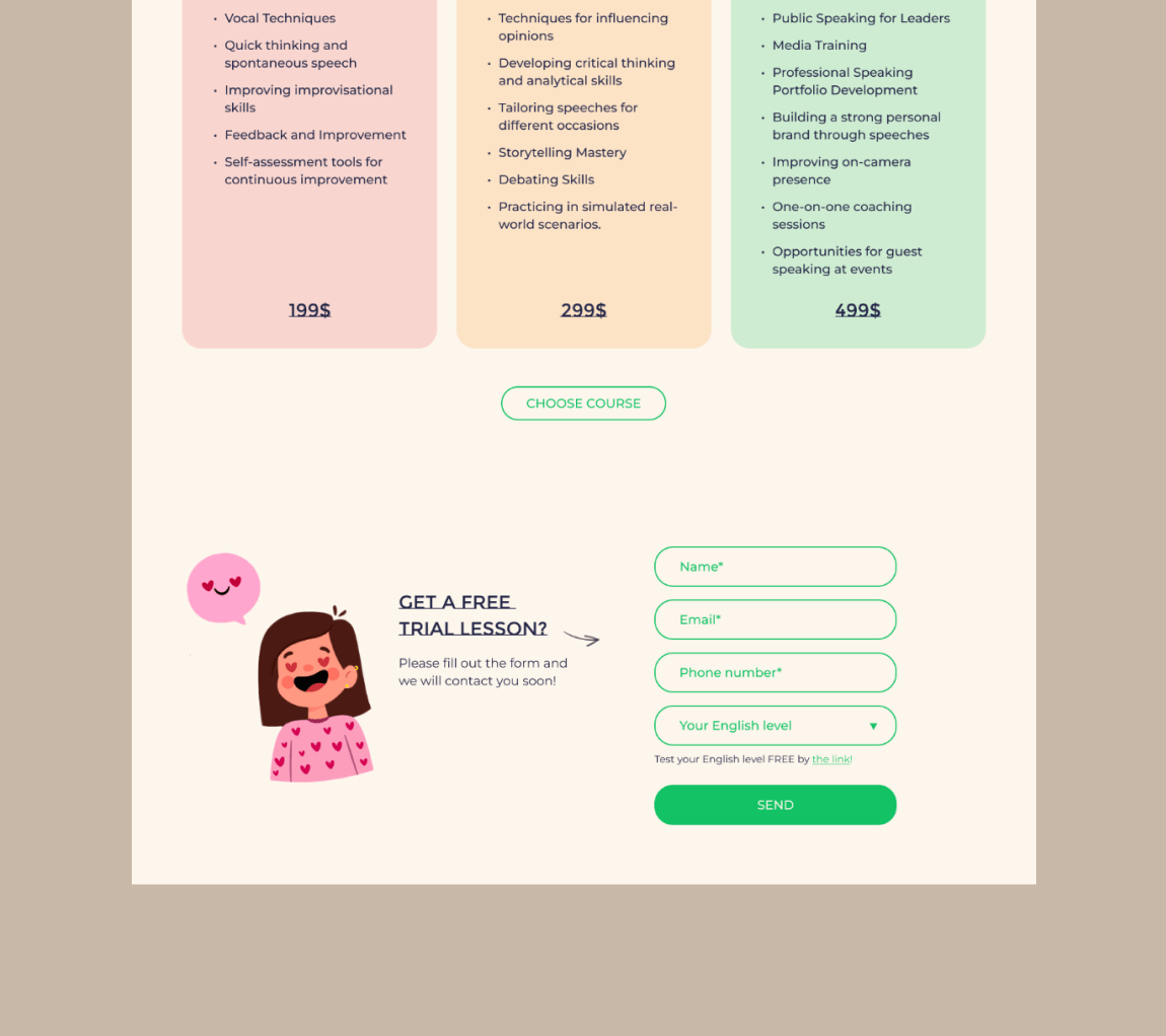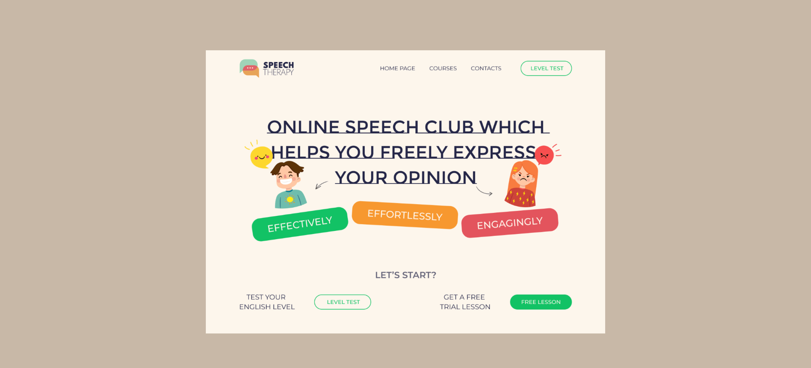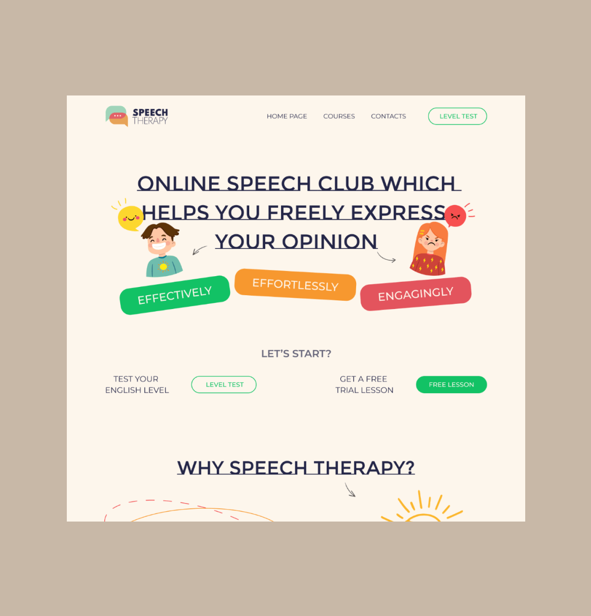 The website was designed for the English Speech Club in Ukraine; the client requested design in bright colors and a playful style, featuring eye-catching elements that attract users’ attention. Design reflects the dynamic atmosphere of the lessons, which take place in a comfortable and game-like format, ensuring convenience and engagement for students.
